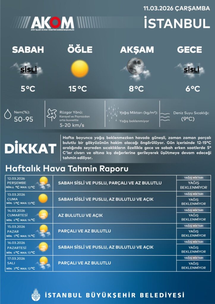 İstanbul Büyükşehir Belediyesi Afet İşleri Dairesi Başkanlığı AKOM’un yayımladığı hava tahmin raporuna göre, 11 Mart Çarşamba günü İstanbul’da sabah ve